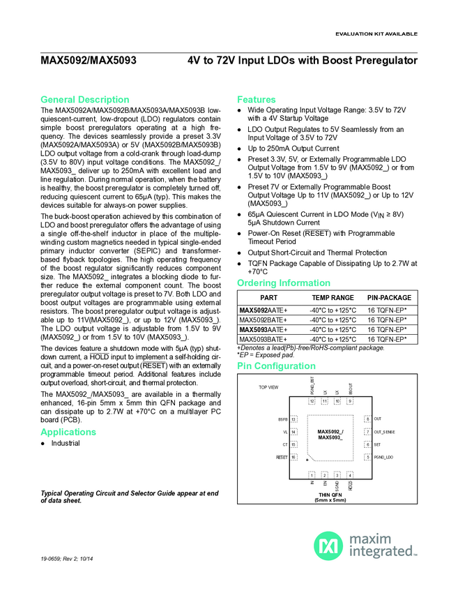MAX5092 4V to 72V Input LDOs with Boost Preregulator