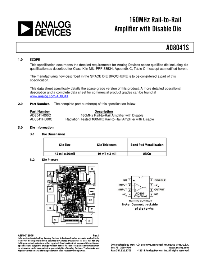 AD8041S Aerospace 160 MHz Rail-to-Rail Amplifier with Disable