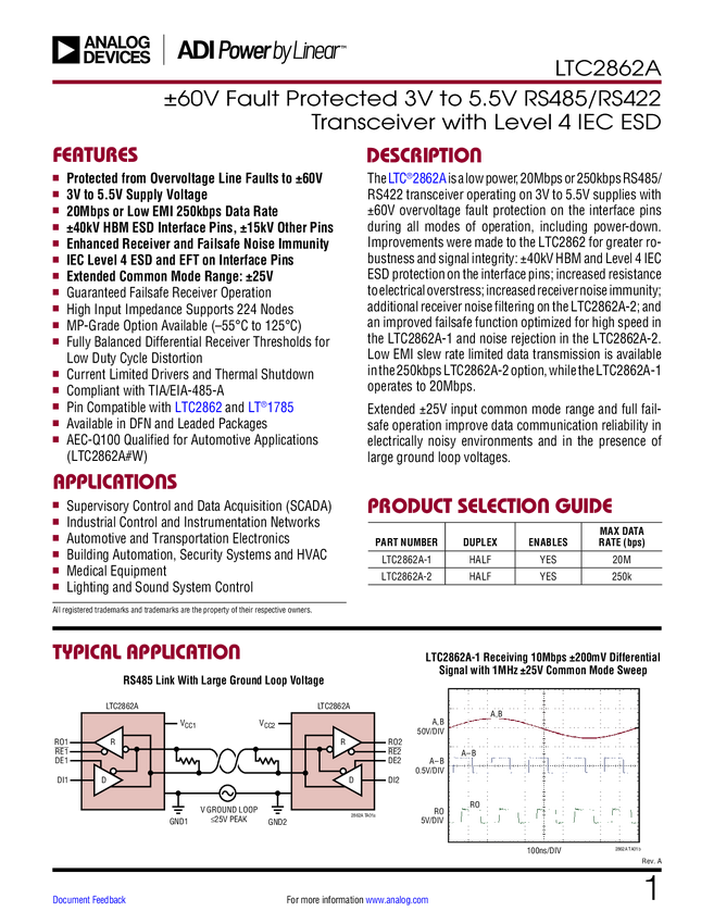 LTC2862A ±60V Fault Protected 3V to 5.5V RS485/RS422 Transceiver with Level 4 IEC ES...