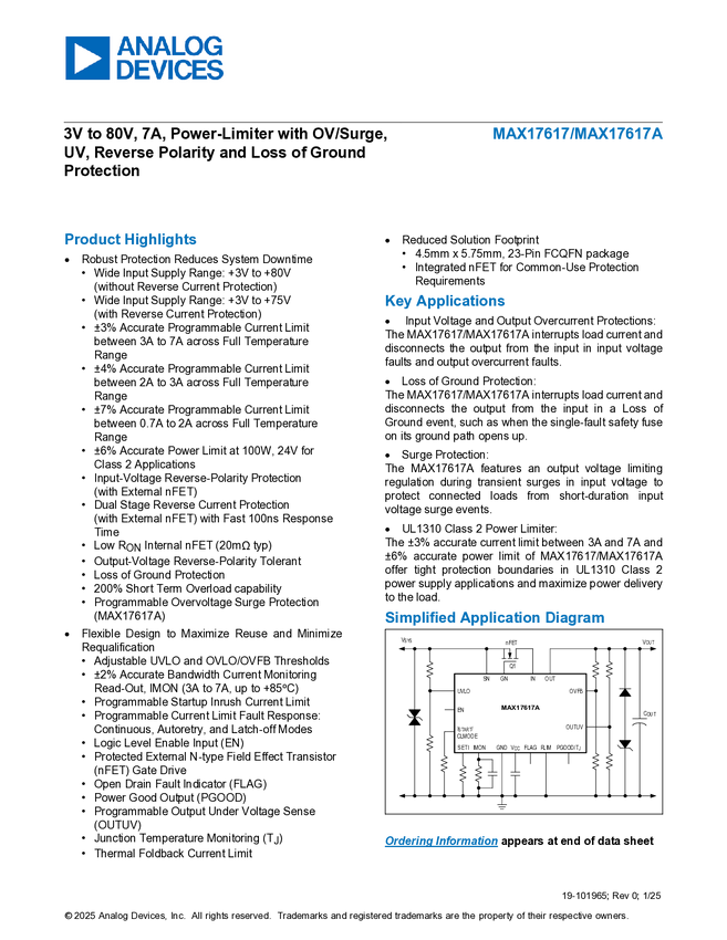 MAX17617A 3V to 80V, 7A, Power-Limiter with OV/Surge, UV, Reverse Polarity and Loss o...
