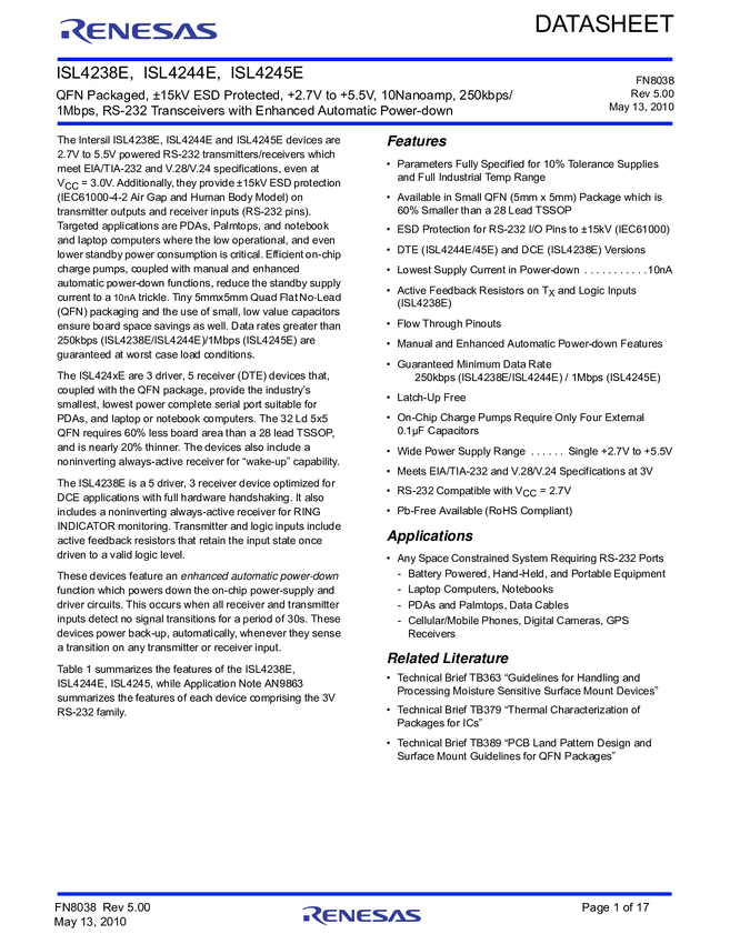 ISL4244E QFN Packaged, ±15kV ESD Protected, +2.7V to +5.5V, 10nA, 250kbps/1Mbps, RS-...
