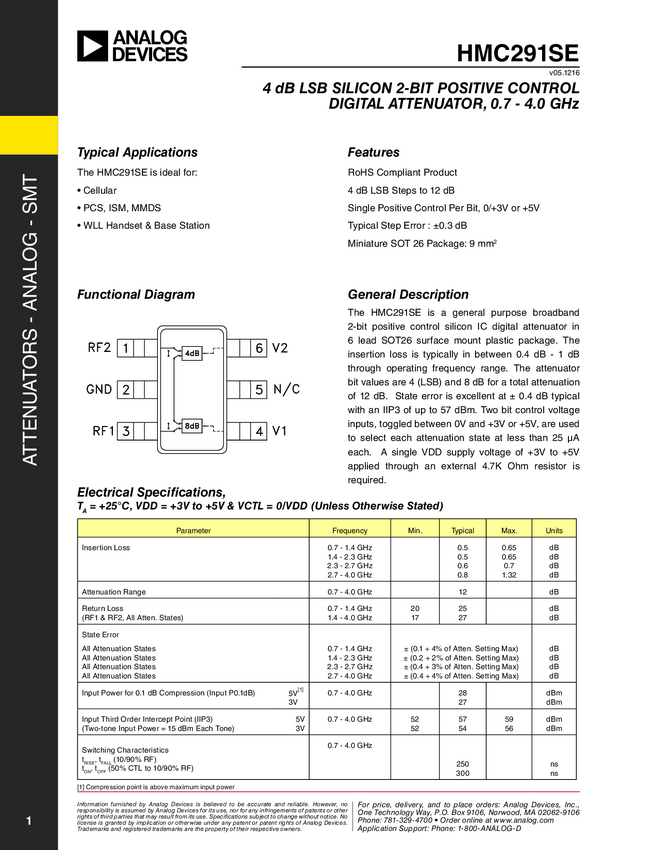 HMC291S 4 dB LSB Silicon 2-Bit Positive Control Digital Attenuator, 0.7 - 4.0 GHz