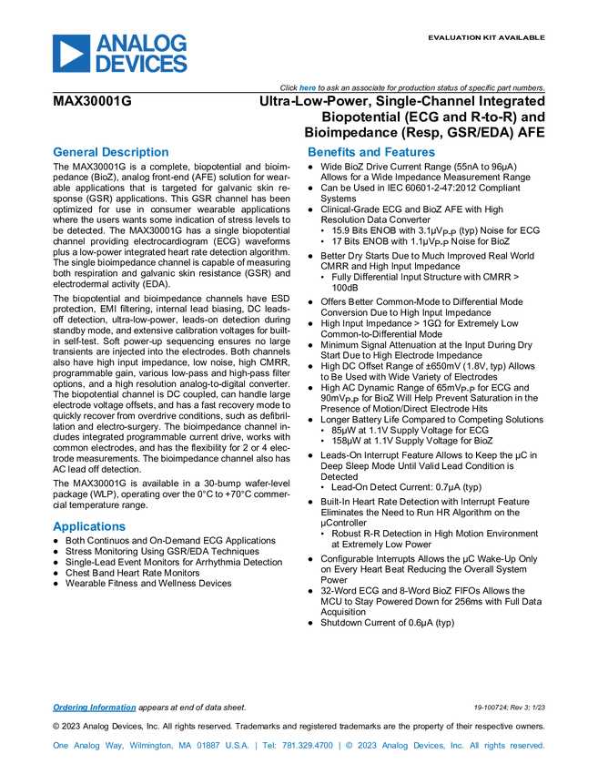 MAX30001G Ultra-Low-Power, Single-Channel Integrated Biopotential (ECG and R-to-R) an...