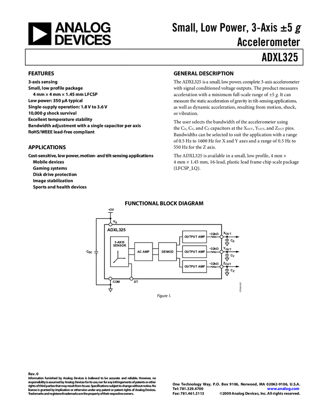 ADXL325 Small, Low Power, 3-Axis ±5 Accelerometer