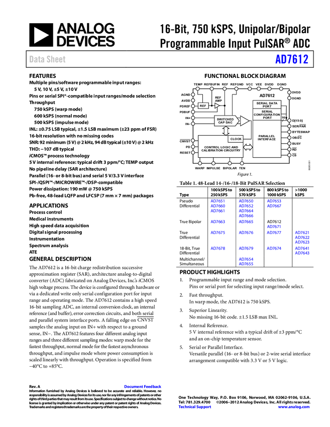 AD7612 16-Bit, 750 kSPS, Unipolar/Bipolar Programmable Input PulSAR ADC