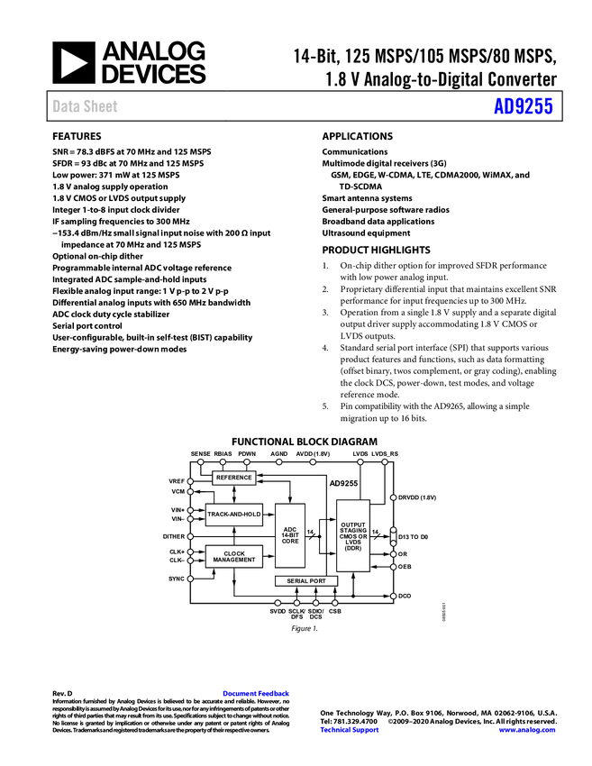 AD9255 14-Bit, 125 MSPS/105 MSPS/80 MSPS, 1.8 V Analog-to-Digital Converter