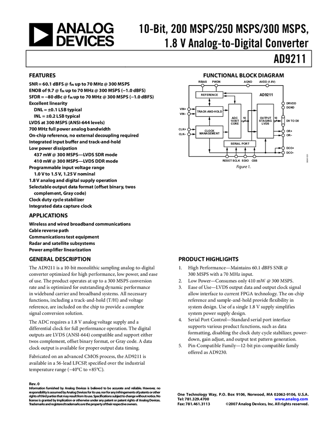 AD9211 10-Bit, 200 MSPS/250 MSPS/300 MSPS, 1.8 V Analog-to-Digital Converter