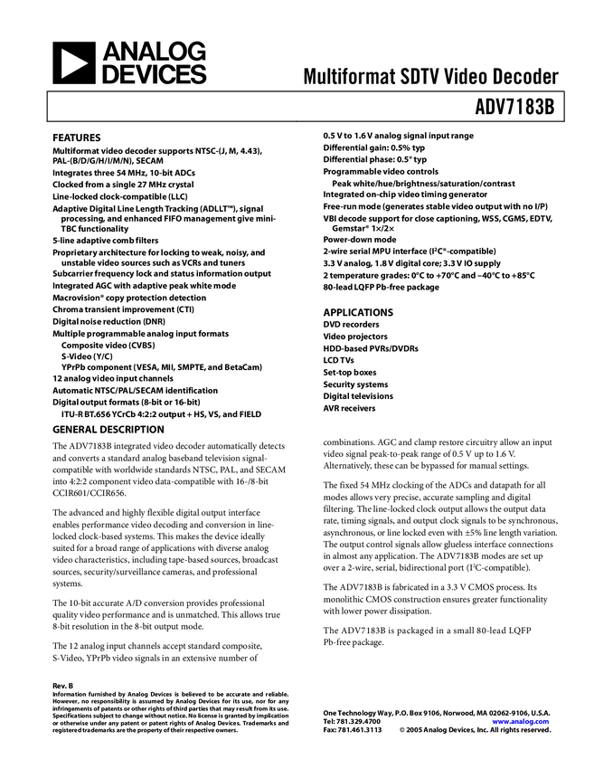 ADV7183B 10-Bit NTSC/PAL/SECAM TV & Video Decoder
