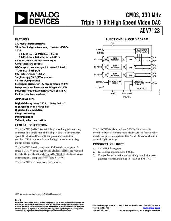 ADV7123 CMOS, 330 MHz Triple 10-Bit High Speed Video DAC