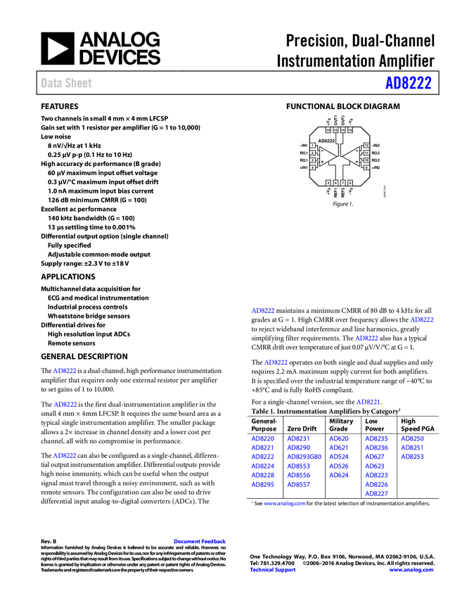 AD8222 Precision, Dual-Channel Instrumentation Amplifier