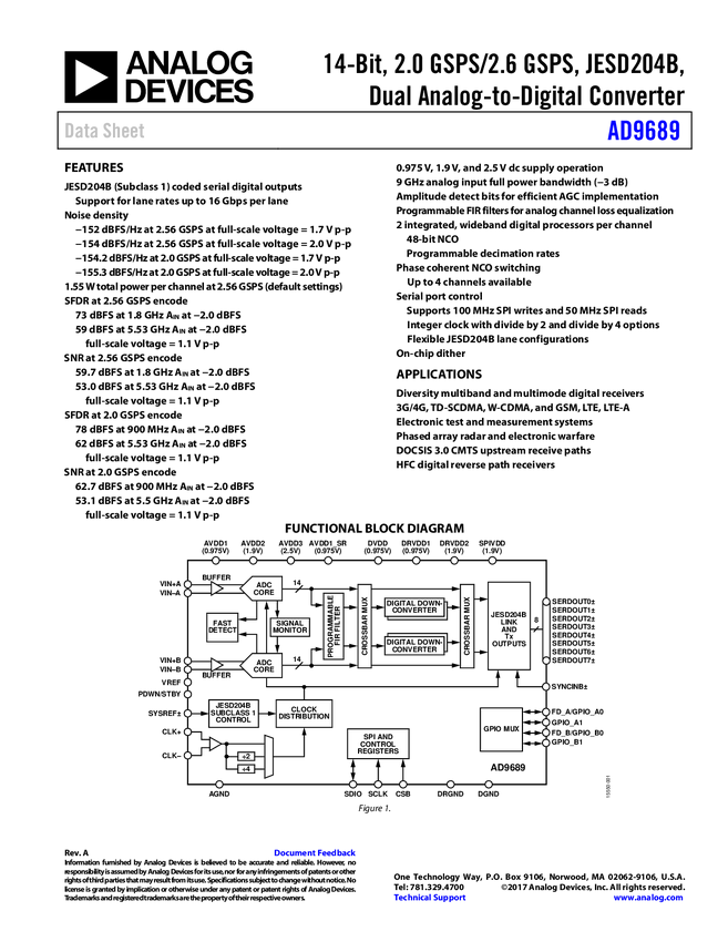 AD9689 14-Bit, 2.0 GSPS/2.6 GSPS, JESD204B, Dual Analog-to-Digital Converter