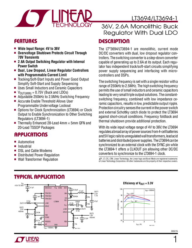 LT3694 36V, 2.6A Monolithic Buck Regulator With Dual LDO