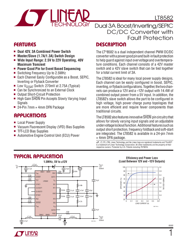LT8582 Dual 3A Boost/Inverting/SEPIC DC/DC Converter with Fault Protection