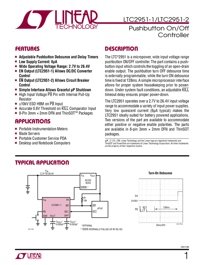LTC2951-1 LTC2951-2 Push Button On/Off Controller