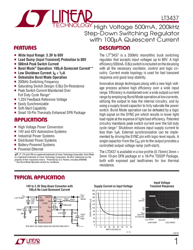 LT3437 High Voltage 500mA, 200kHz Step-Down Switching Regulator with 100µA Quiesce...