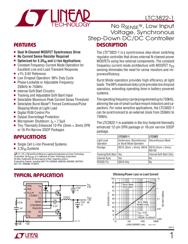 LTC3822-1 No R, Low Input Voltage, Synchronous Step-Down DC/DC Controller