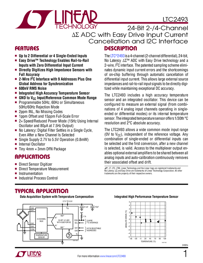 LTC2493 24-Bit 2-/4-Channel ∆Σ ADC with Easy Drive Input Current Cancellation and I...