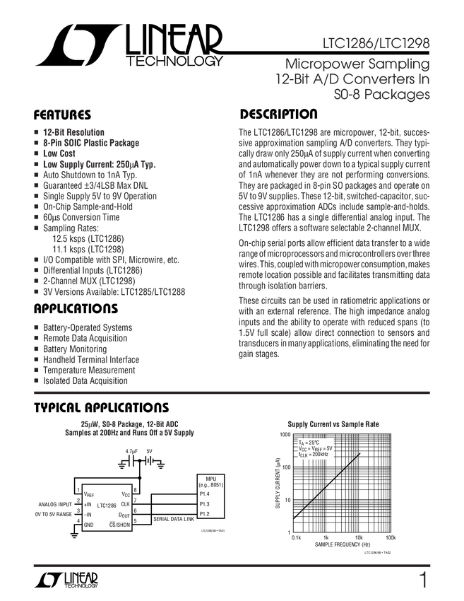 LTC1286 Micropower Sampling 12-Bit A/D Converters In S0-8 Packages