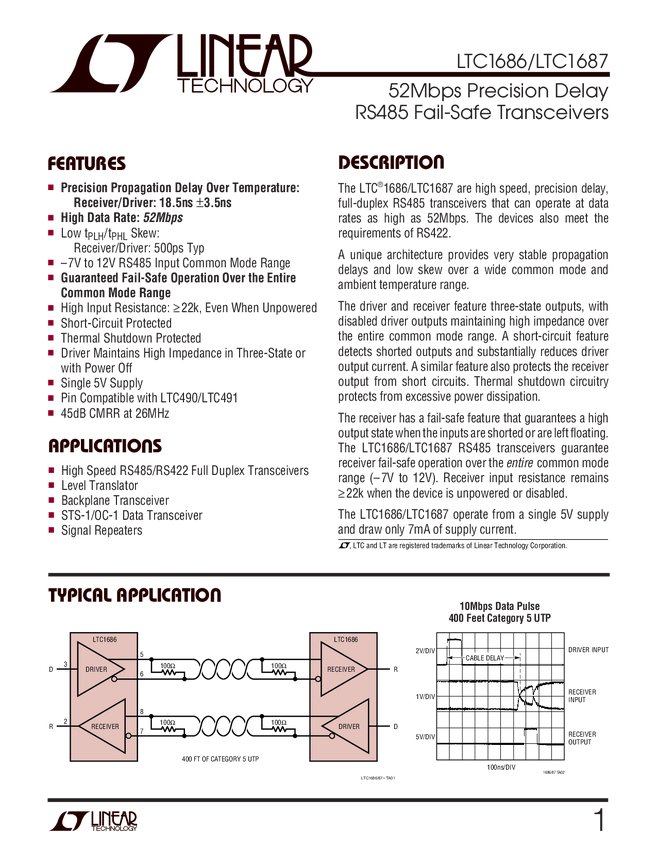 LTC1686 52Mbps Precision Delay RS485 Fail-Safe Transceivers