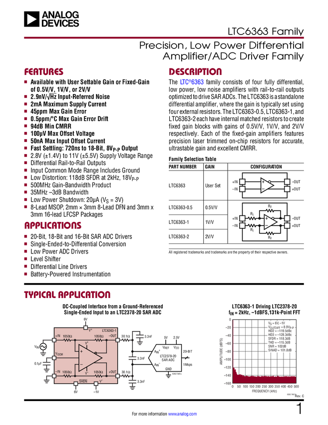 LTC6363 Precision, Low Power Differential Amplifier/ADC Driver Family