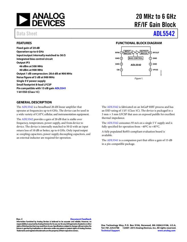 ADL5542 20 MH to 6 GHRF/IF Gain Block, Fixed Gain of 20 B