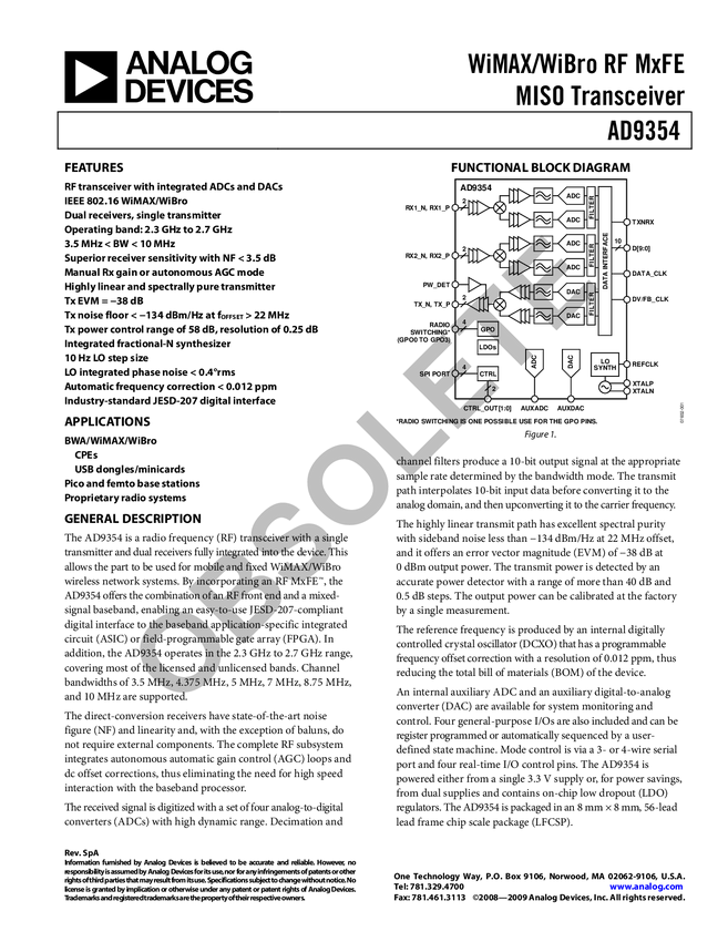 AD9354 WMAX/WBRO RF MFE™ MISO Transceiver