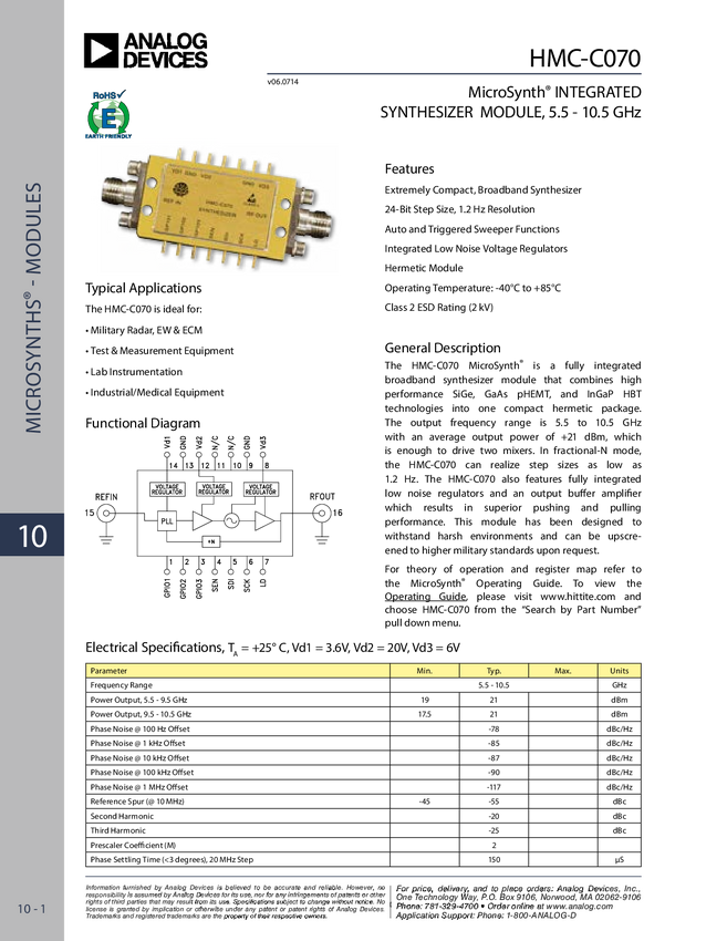 HMC-C070 MicroSynth Integrated Synthesizer Module, 5.5 - 10.5 GHz