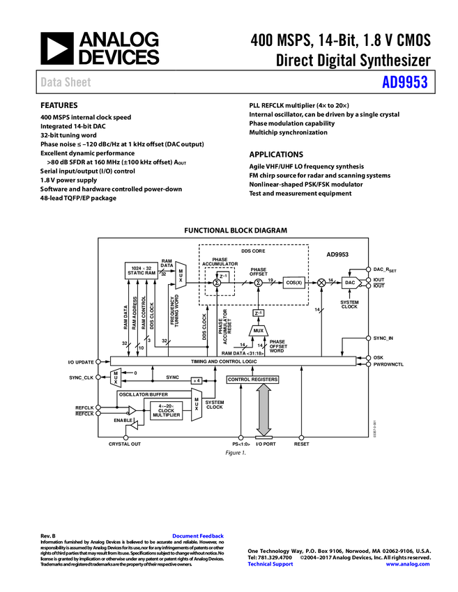 AD9953 400 MSPS, 14-Bit, 1.8 V CMOS Direct Digital Synthesizer