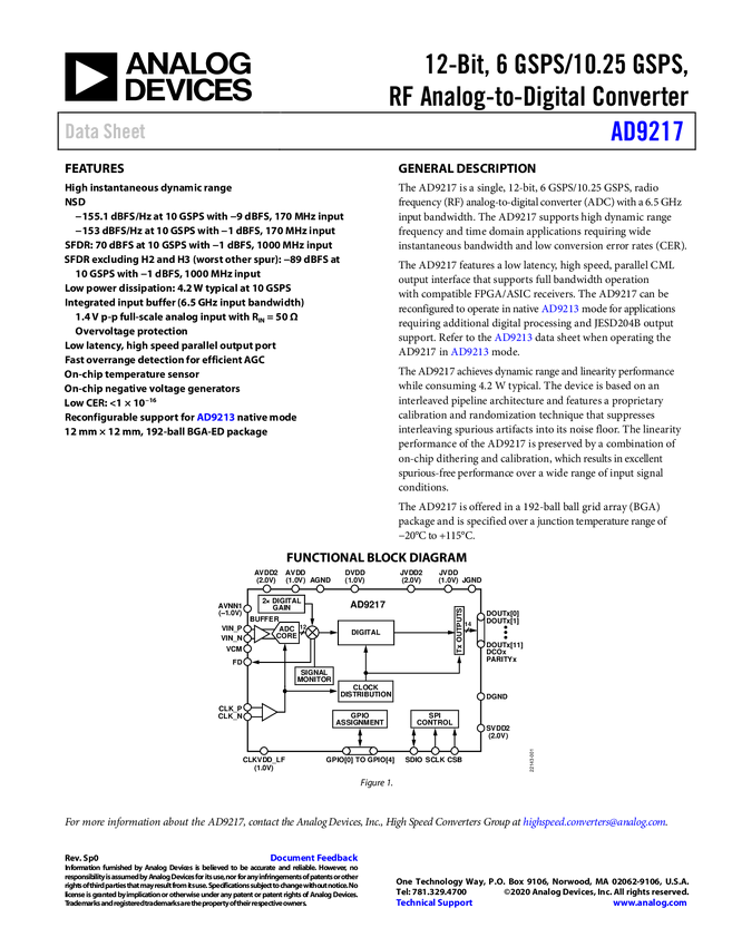 AD9217 12-Bit, 6 GSPS/10.25 GSPS, RF Analog-to-Digital Converter