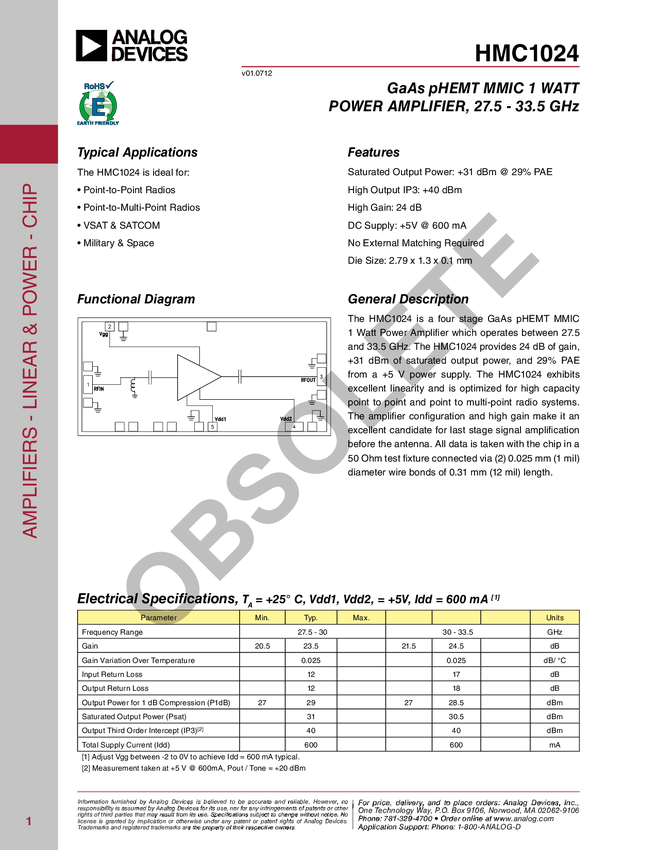 HMC1024 1 Watt Power Amplifier Chip, 27.5 - 33.5 GHz