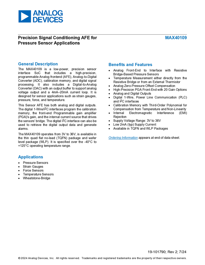 MAX40109 Precision Signal Conditioning AFE for Pressure Sensor Applications