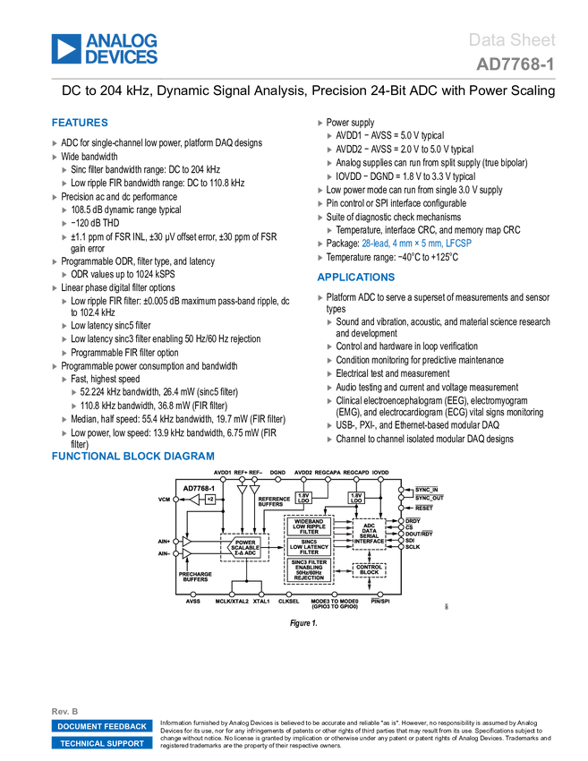 AD7768-1 DC to 204 kHz, Dynamic Signal Analysis, Precision 24-Bit ADC with Power Sca...