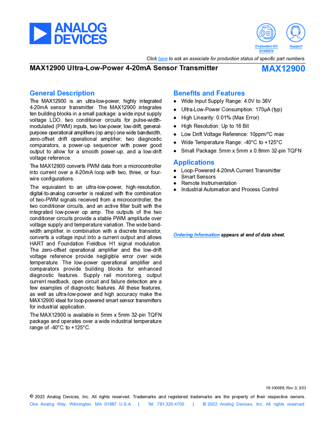 MAX12900 Ultra-Low-Power 4-20mA Sensor Transmitter