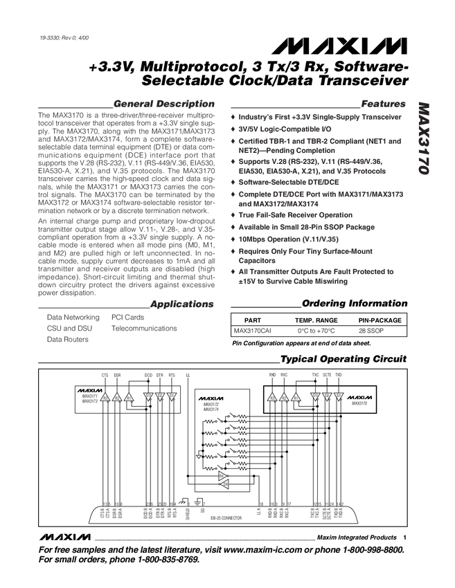 MAX3170 +3.3V, Multiprotocol, 3 Tx/3 Rx, Software-Selectable Clock/Data Transceiver