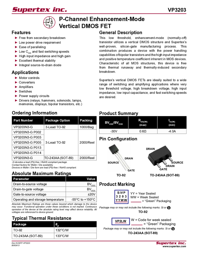 VP3203 Datasheet - P-Channel Enhancement-Mode Vertical DMOS FET