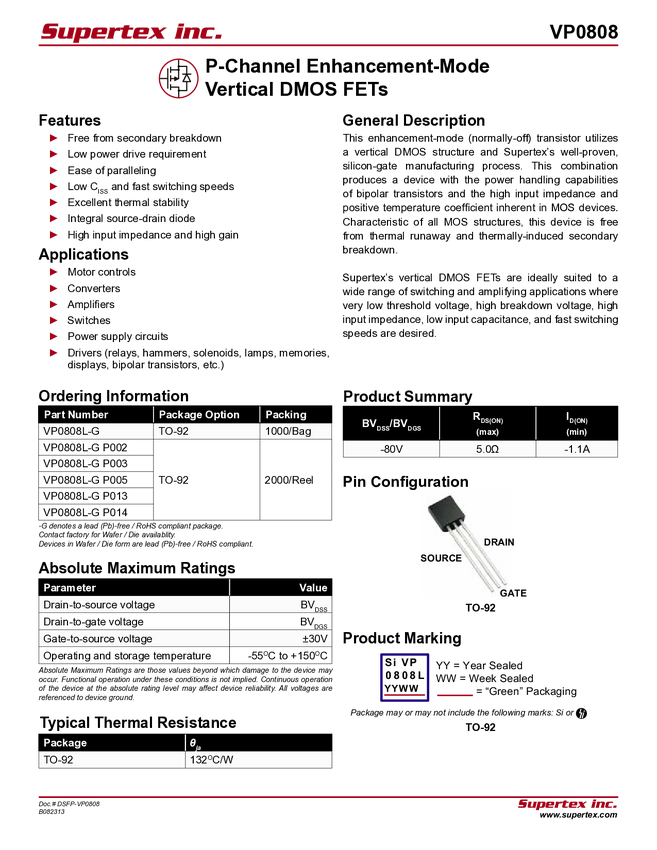 VP0808 Datasheet - P-Channel Enhancement-Mode Vertical DMOS FET