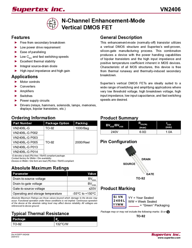 VN2406 N-Channel Enhancement-Mode Vertical DMOS FET Data Sheet
