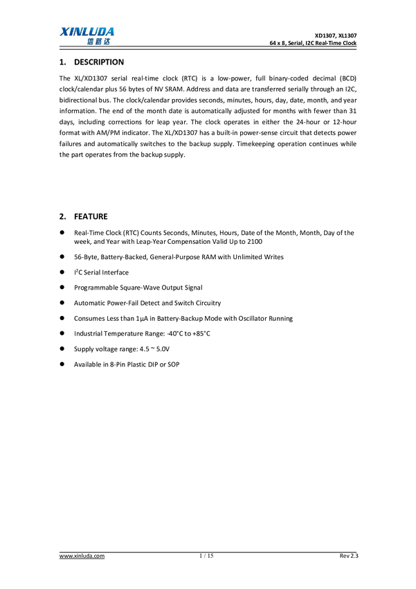 Układ scalony; XD1307; zegar RTC; I2C; SRAM: 56B; 4,5-5,5V DC; DIP8; THT; = DS1307+; RoHS; XINLUDA