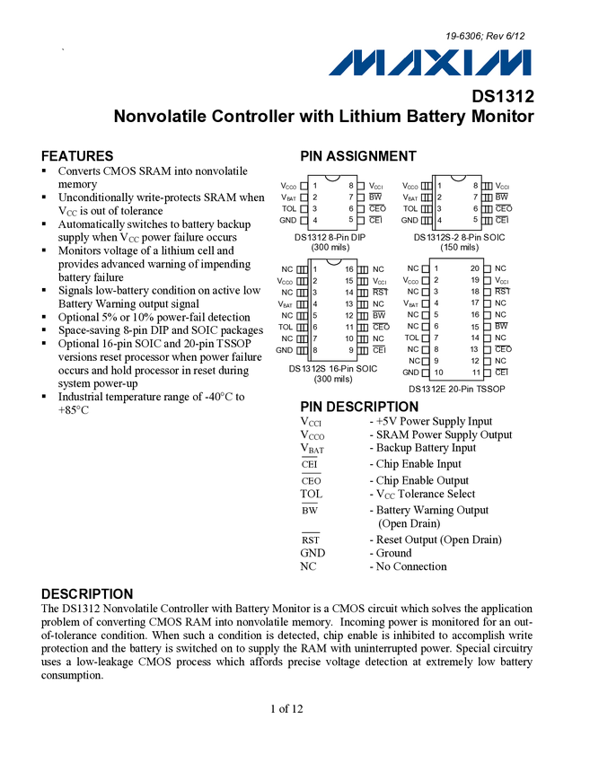 DS1312 Nonvolatile Controller with Lithium Battery Monitor