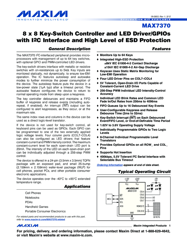 MAX7370 8 x 8 Key-Switch Controller and LED Driver/GPIOs with I²C Interface and Hig...