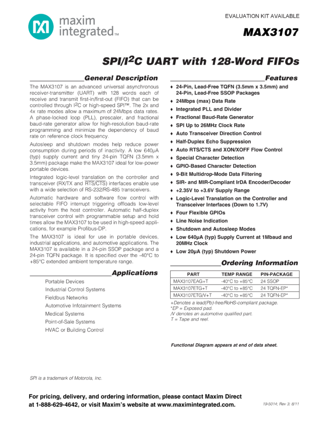 MAX3107 SPI/I²C UART with 128-Word FIFOs