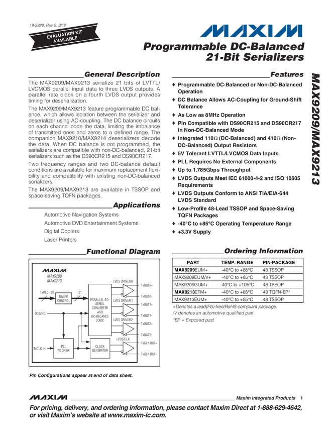 MAX9209 Programmable DC-Balanced 21-Bit Serializers