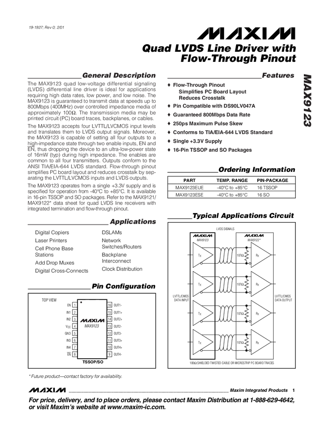 MAX9123 Quad LVDS Line Driver with Flow-Through Pinout