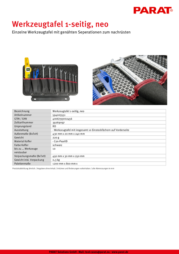 594003551 Tablica na narzędzia Parat 594003551 Wymiary: (D x S x W) 430 x 20 x 240 mm