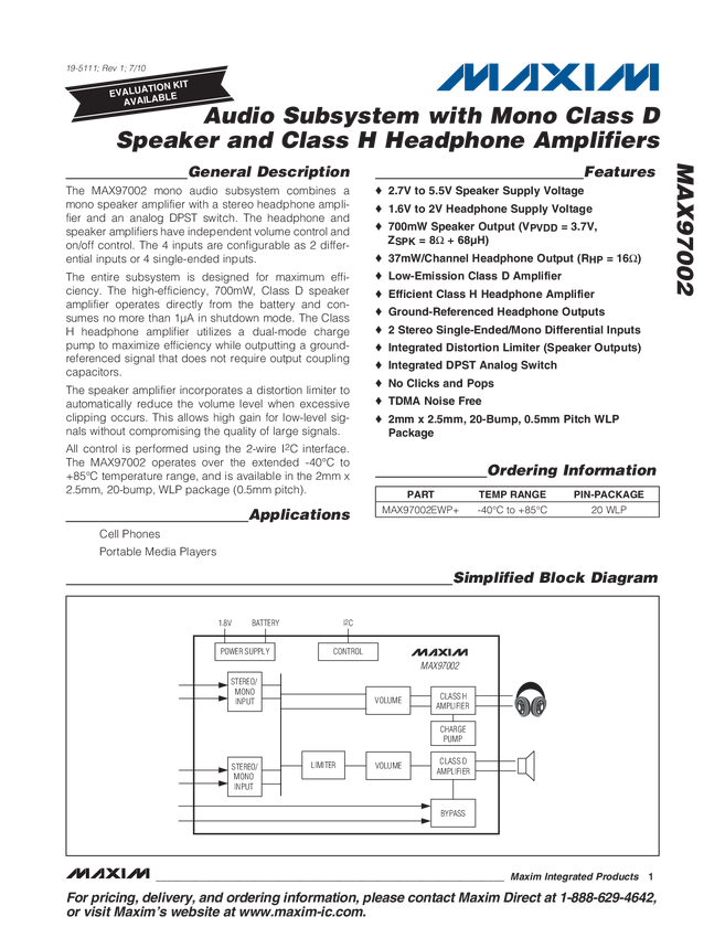 MAX97002 Audio Subsystem with Mono Class D Speaker and Class H Headphone Amplifiers