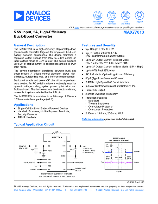 MAX77813 5.5V Input, 2A, High-Efficiency Buck-Boost Converter
