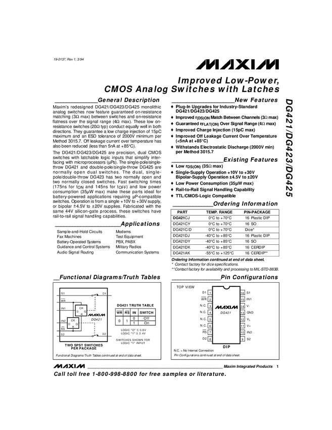 DG421 Improved Low-Power, CMOS Analog Switches with Latches