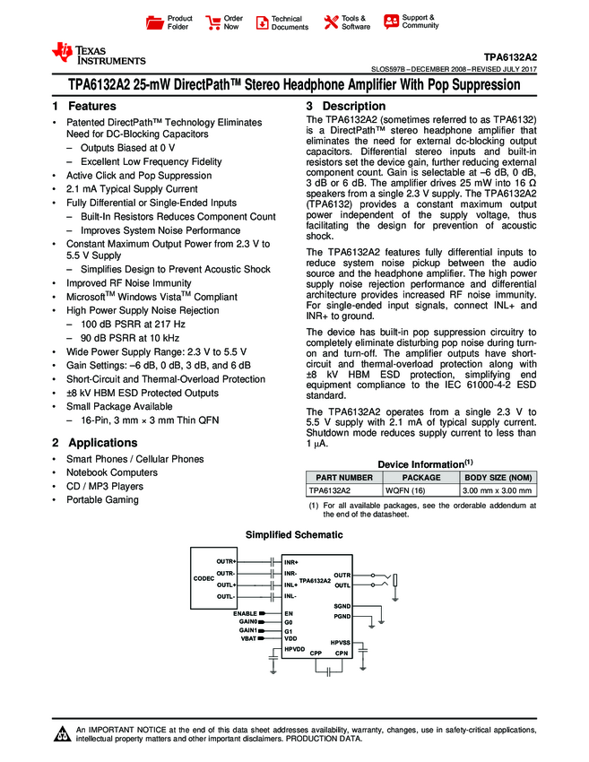 Układ scalony; TPA6132A2RTER; IC; wzmacniacz audio; 25mW; 16Ohm; 2 kanały; 2,3-5,5V; QFN16; SMD; TEXAS INSTRUMENTS; RoHS; op/100szt