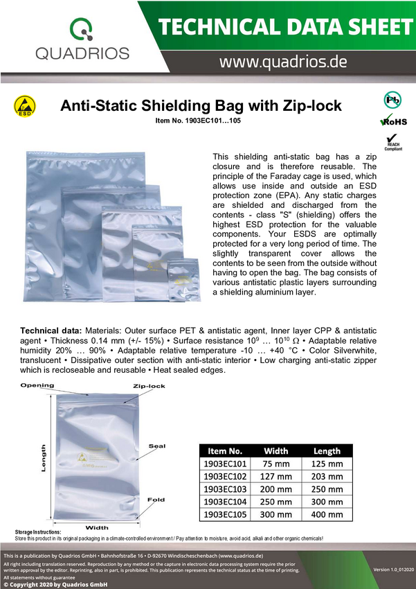1903EC105 Torba ESD (D x S) 300 mm x 400 mm ekranowanie Kod ESD S Quadrios