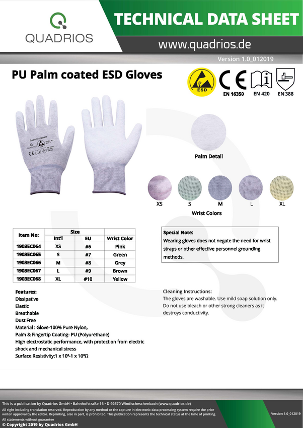 1903EC067 Quadrios Rękawiczki ESD Rozmiar ubrania: L poliamid, polireutan
